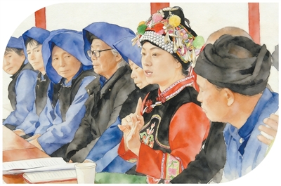 全国代表、云南省大理白族自治州南涧彝族自治县碧溪乡凤仙村村平易近鲁丽华(左三)正在南涧彝族自治县山镇新政村宣讲全国。适志宏摄(发)。
