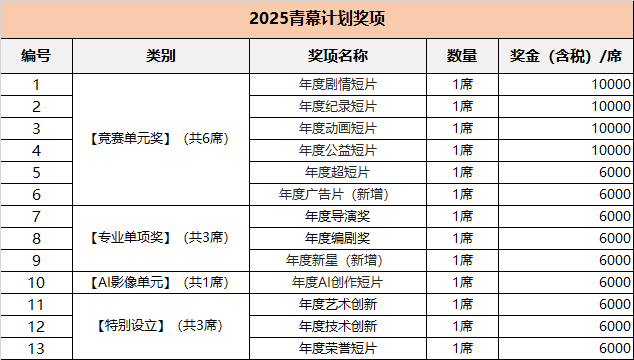 青幕打算做为一个面向青年影像创做者的搀扶打算,旨正在汇聚有才调、有胡想的青年创做者。“影力共振”强调这些创做者之间的聚合效应,他们通过交换、合做、合作,配合提拔创做程度,构成一股强大的创做力量。2025年,搜狐青幕打算持续深耕青年影像创做范畴,以建立良性竞赛生态为焦点,打制兼具专业性取性的展现平台。通过青幕大师课、行业沙龙、创投对接等多元勾当,建立集做品展映、身手交换、资本对接于一体的成长系统,正在激发创做活力的同时,推进青年创做者取片子财产生态的深度融合,为影像立异注入持续动能。此次勾当由搜狐集团(涵盖搜狐新消息手艺无限公司、搜狐互联网消息办事无限公司、飞狐消息手艺(天津)无限公司、片子家协会等)从办,以下简称“从办方”或“组委会”。① 搜集对象:本届青幕打算面向45岁以下全国片子电视收集视听机构、影视传媒院校、内容出产企业等相关单元以及制做人、影视制做从业者参赛。对参赛做品类型不做。⑥ 如需添加水印,请于左上角标注“青幕打算”或“青幕打算Preview”,此外画面内容不得有任何其他水印标识表记标帜,免得影响评委旁不雅。⑧ 若影片已正在其他片子节、影展获得项,需正在报名表上列出所获项具体消息(需标来岁份、项)。l 注:剧情片组别、记载片组别、公益短片组别时长为5分钟到45分钟;动画片组别时长为0到45分钟。l 以上组别参赛做品若完整影片不克不及线上公映,则参赛者必需上传可供参赛评审的完整成片及答应搜狐及其联系关系方线上播放的预告片。l 时长、题材不限,正在不学问产权和其他法令律例的前提下,具有贸易元素的动画短片、记载短片、剧情短片、尝试短片、微片子等。 搜狐有权要求参赛者供给完整的内容权属证明。如平台发觉参赛做品的内容为搬运、抄袭等非原创/侵权内容,搜狐有权下线响应内容并打消参赛者参取勾当的资历。5。 选择并复制做品视频网址,前去青幕打算官网报名页面阅读章程,填写报名表和参赛消息,于指定处填入做品的搜狐视频网址并提交。l 要求超短片组别、告白片组别参赛做品正在2025年8月26日至2026年2月26日期间连结公开形态。(不成删除或设为自见;删除、自见的评选做品无法获。)l 以上两个单位正在搜狐视频APP按要求上传后,需复制视频链接正在官网继续完成报程,于报名页面填写该参赛做品的搜狐视频链接及相关从创消息,不得反复送达。l 时长、题材不限,正在不学问产权和其他法令规的前提下,要求AICG手艺创做而成的剧情短片、尝试短片包罗但不限于视觉创意、现代艺术、尝试视频等。 搜狐有权要求参赛者供给完整的内容权属证明。如平台发觉参赛做品的内容为搬运、抄袭等非原创/侵权内容,搜狐有权下线响应内容并打消参赛者参取勾当的资历。【专业单项】、【出格设立】将会正在入围影片中以各项尺度择优选出,以【致敬典范】为名传送对证量、传承取立异的苦守。通过影像做品挖掘“匠心”取“时代符号”,通过青年导演的创意沉构,付与品牌新的生命力,激发跨代际感情共识。注:除从竞赛单位外增设从题展映单位或贸易赞帮单位,针对增设单位会增设对应项。参赛者无需反复送达,从办方会正在入围影片当选择合适从题的影片。进行入围通知时,从办方将取参赛者二次确认能否加入【增设单位】。已确认【增设单位】影片不得以任何来由撤回或退出,如参赛者不加入【增设单位】则默认退出合作【增设单位】对应项资历,但不影响其从竞赛单位各单位及各项参选资历及成果。统一部影片仅能送达一个竞赛单位,不得反复报名。如遇组委会鉴定影片取所送达竞赛单位不合适的环境,组委会有权变动影片参取评选的竞赛单位。